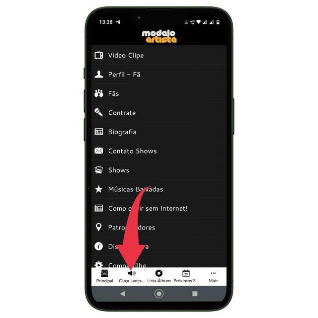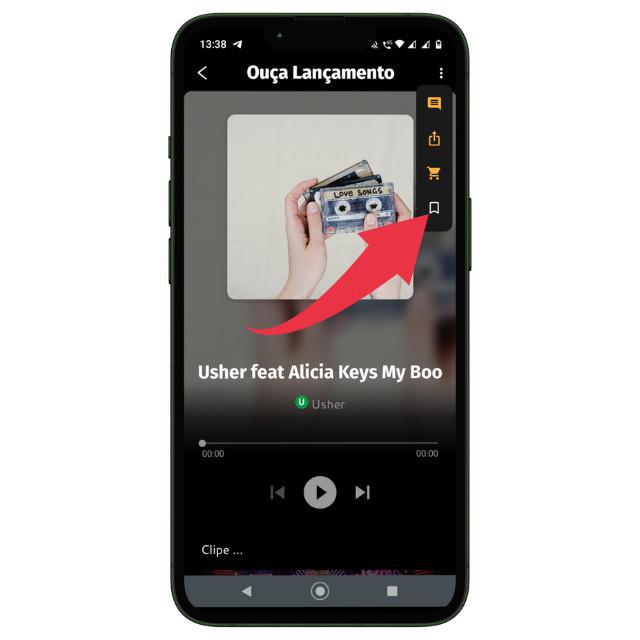 Para ouvir a musica ou a playlist preferida (sem internet e não gastar seus dados), é preciso que em um ambiente com internet wi-fi descarregue os audios fazendo download em seu celular, primeiramente localize o áudio e clique no simbolo da (Estrela ou bandeira), no canto superior direito do app conforme imagem abaixo.